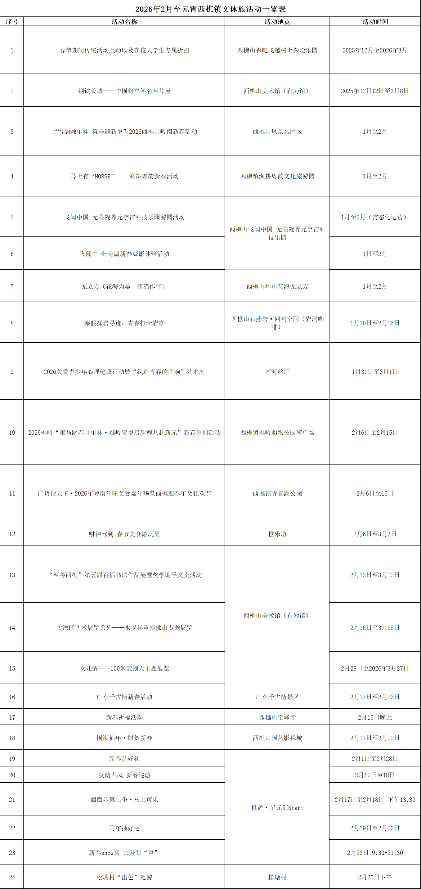 2026年2月至元宵西樵镇文体旅活动一览表