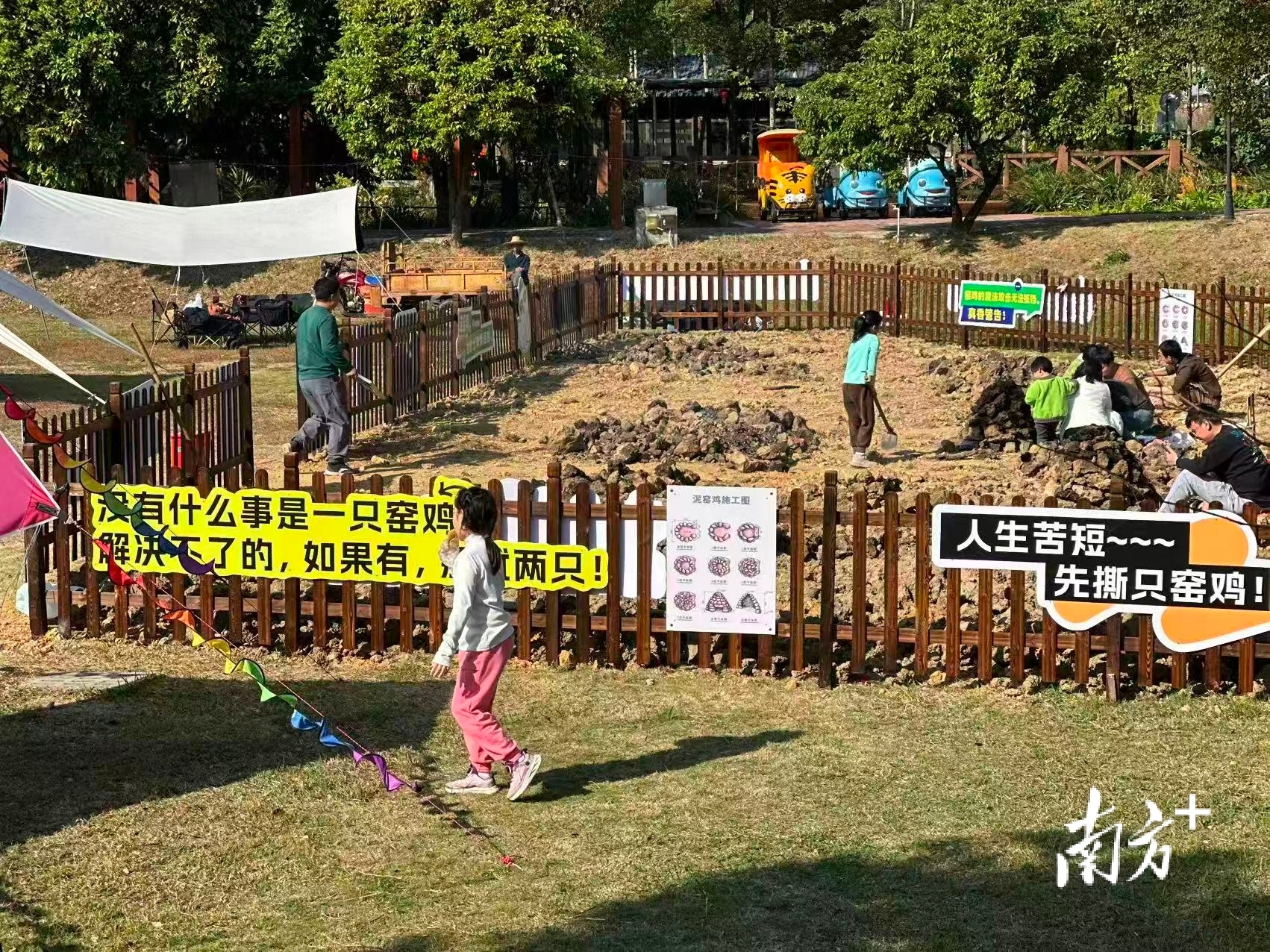 桑基鱼塘烟火趣:在渔耕粤韵文化旅游园体验搭土窑、焖泥窑鸡的全过程,还能奶瓶喂鱼、骑电动车漫游。