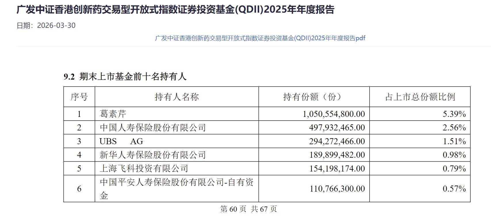除了葛素芹以外,在广发中证香港创新药ETF的前十大持有人中,截至2025年底,中国人寿位列第二大持有人,持有份额为4.98亿份,瑞银集团、新华人寿保险股份有限公司、上海飞科投资有限公司持有份额均超过1.5亿份。