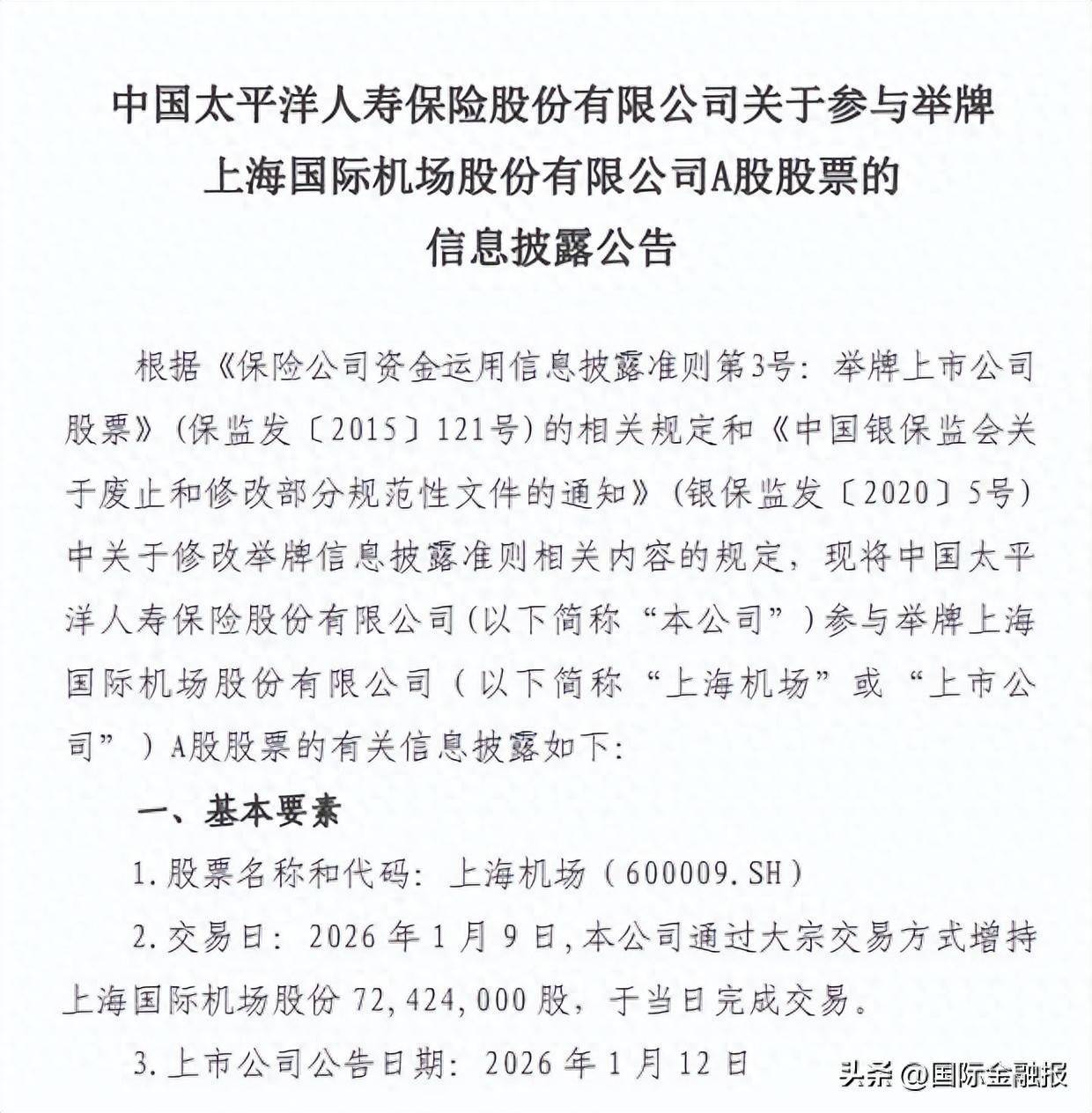 1月14日,中国太平洋人寿保险股份有限公司(下称“太保寿险”)披露公告称,公司通过大宗交易方式增持上海国际机场股份有限公司(下称“上海机场”)A股股票7242.40万股。