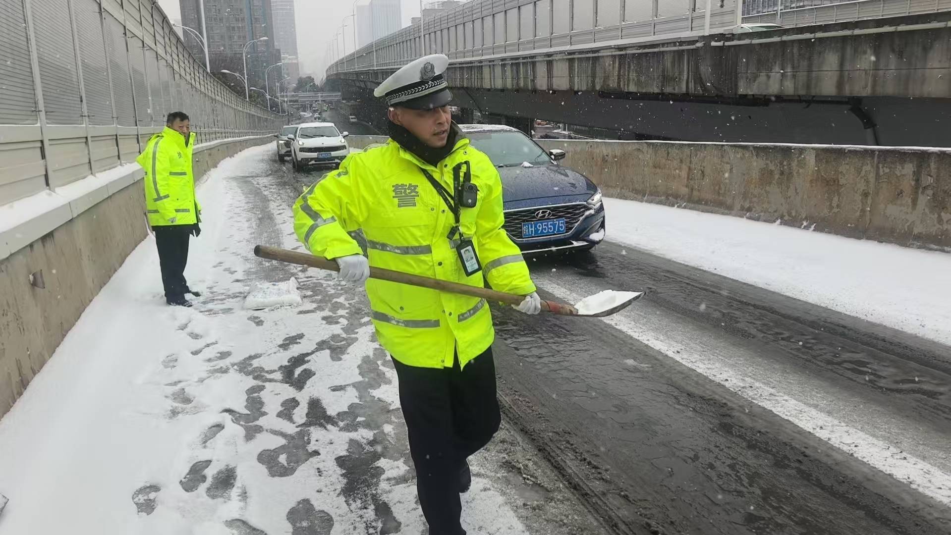 1月20日,武汉迎来大范围低温雨雪天气,洪山辖区高架、环线等路段出现结冰情况。洪山交警闻雪而动,按照恶劣天气道路交通安全应急处置战勤工作预案,全警上路,全力以赴的迅速投入到低温雪天交通安全保障工作中。