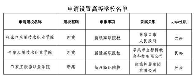 根据《中华人民共和国高等教育法》《高等职业学校设置标准(暂行)》等有关规定,经河北省高等学校设置评议委员会专家考察和评议,新设张家口应用技术职业学院、辛集应用技术职业学院、石家庄康养职业学院事项获得通过,现将学校名单向社会公示。