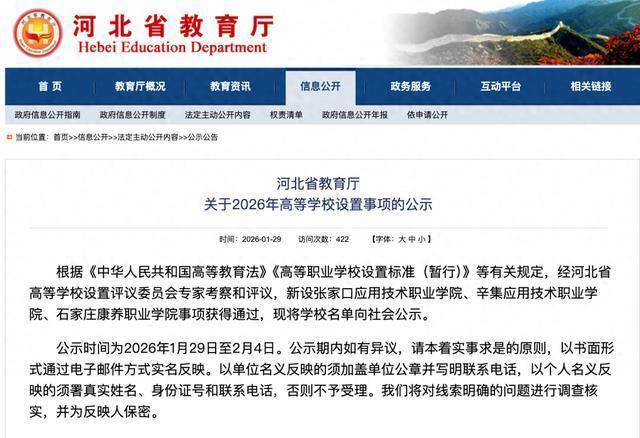 1月29日南宁股票配资,河北省教育厅网站发布关于2026年高等学校设置事项的公示。