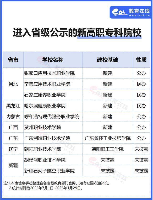 另外10所进入省级教育部门公示环节的拟新设高职专科院校中,6所院校为新建,2所未披露建校基础,广东制造职业技术学院拟于广东省轻工业技师学院基础上设置,朝阳职业技术学院拟由朝阳职工工学院改制而来。