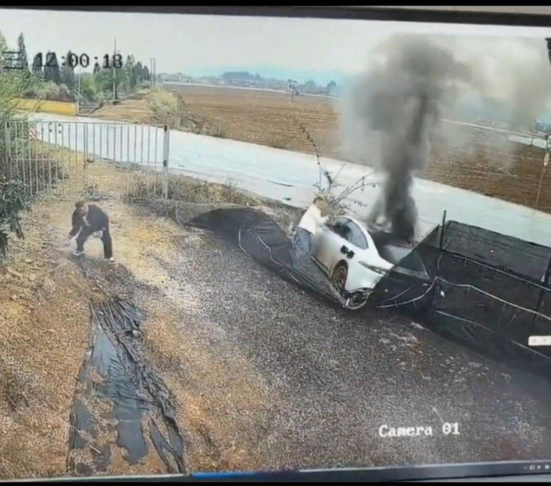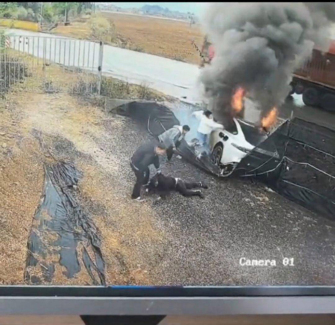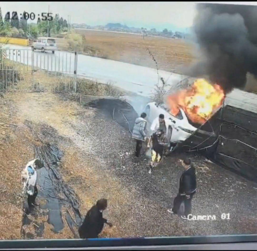 视频显示,一辆白色小车失控滑入路旁沟里,随后冒出浓烈黑烟和火焰。在1分钟内,该车司机和赶来救援的2名男子(白衣和灰衣男子)砸破车窗,拽出3人。其中白衣男子连续拽3人过程。