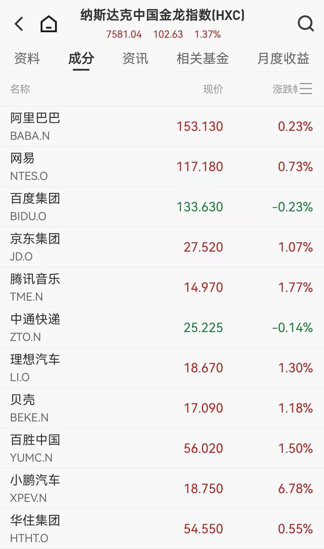 中概股多数走强,纳斯达克中国金龙指数上涨1.37%。小鹏汽车、万国数据、世纪互联涨超6%,阿里巴巴、拼多多、京东均小幅上涨,台积电涨幅领先。不过百度小幅下跌0.23%,富途控股跌近2%。