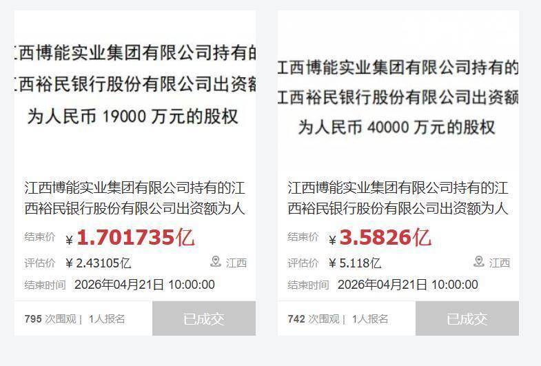 4月21日,江西裕民银行原第二大股东博能实业所持5.9亿股股权,对应持股比例29.5%,在司法平台公开拍卖。该标的拆分为4亿股、1.9亿股两个包,整体起拍价为5.28亿元,较评估价打七折。两笔股权均只有1家意向方报名参与,最终均以起拍底价直接成交,南昌市红谷滩城投、南昌水业分别竞得对应股权。